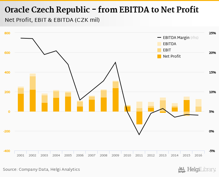 As far as Oracle Czech Republic's peers are concerned, Oracle Czech Republic posted net and EBITDA margin of 0.100% and 4.00%, respectively in 2016, Microsoft Czech Republic generated margins of 9.88% and 16.0% and SAP Czech Republic profit margin reached 5.75% on the net and 8.25% on the EBITDA level in 2019.