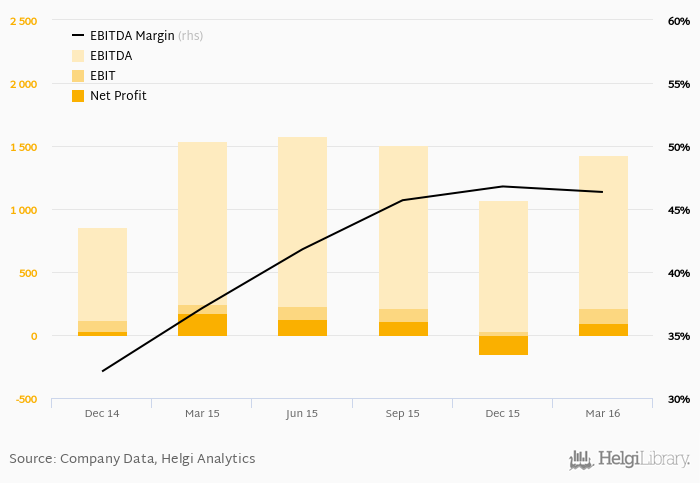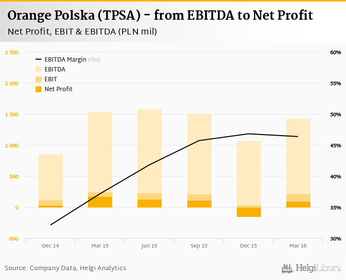 Orange Polska (TPSA) made a net profit of PLN 98.0 mil with revenues of PLN 2,803 mil in 1Q2016, up by 164% and down by 4.2%, respectively, compared to the previous year. This translates into a net margin of 1.55%.