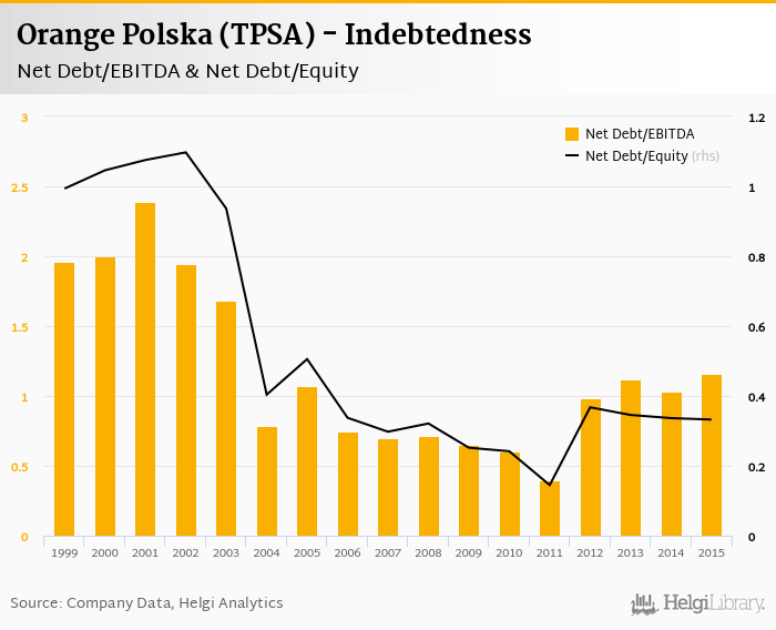 Orange Polska (TPSA)'s net debt stood at PLN 3,982 mil and accounted for 0.332 of equity at the end of 2015. The ratio is down 0.004 pp compared to the previous year.