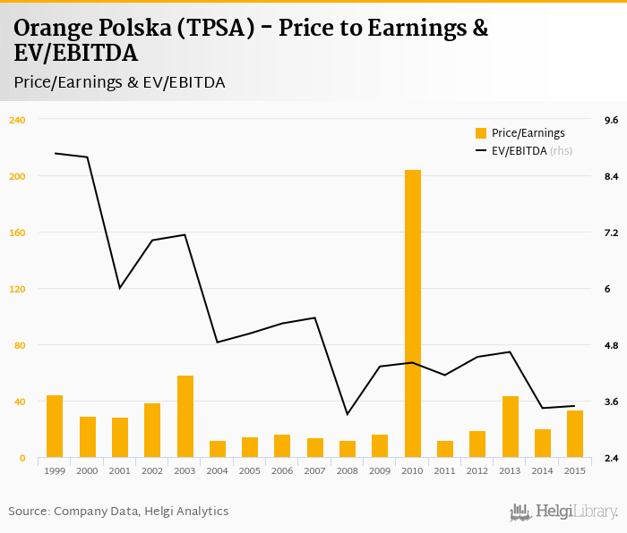 Orange Polska (TPSA) stock traded at EUR 6.56 per share at the end 2015 translating into a market capitalization of USD 2,206 mil.