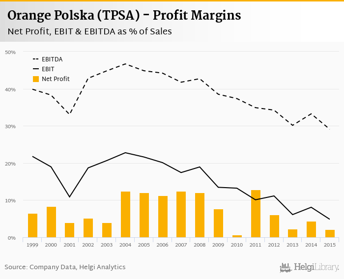 Orange Polska (TPSA) made a net profit of PLN 254 mil with revenues of PLN 11,840 mil in 2015, down by 52.5% and down by 3.05%, respectively, compared to the previous year.