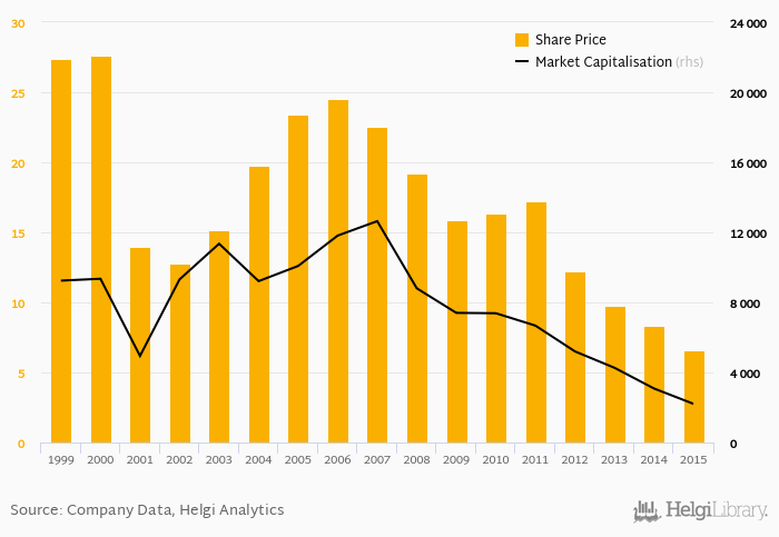 Since the end of 2010, stock has appreciated by -59.9% implying an annual average growth of -16.7% In absolute terms, the value of the company fell by USD 5,176 mil.