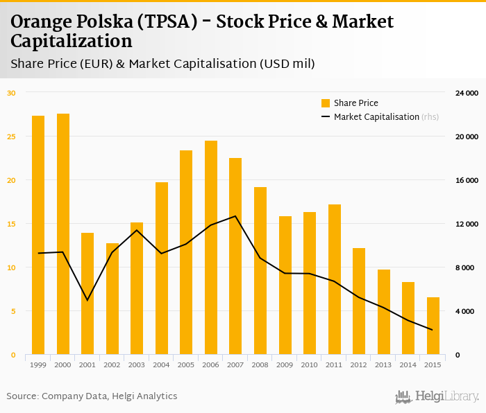 Orange Polska (TPSA) stock traded at EUR 6.56 per share at the end 2015 implying a market capitalization of USD 2,206 mil.