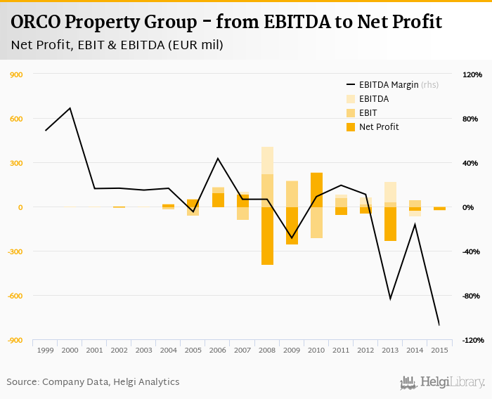 ORCO Property Group made a net profit of EUR -20.5 mil with revenues of EUR 14.0 mil in 2015, up by 13.3% and down by 81.4%, respectively, compared to the previous year. This translates into a net margin of -147%.