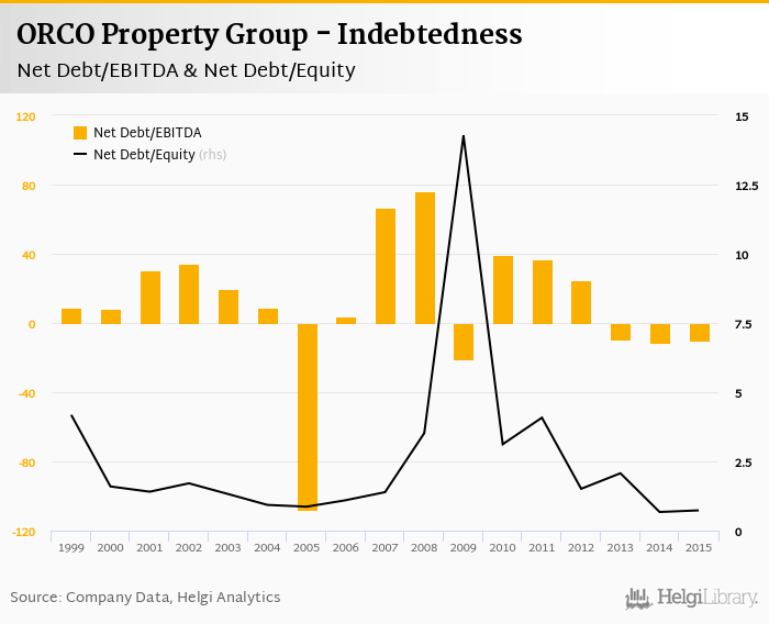 ORCO Property Group's net debt stood at EUR 150 mil and accounted for 0.731 of equity at the end of 2015. The ratio is up 0.058 pp compared to the previous year.