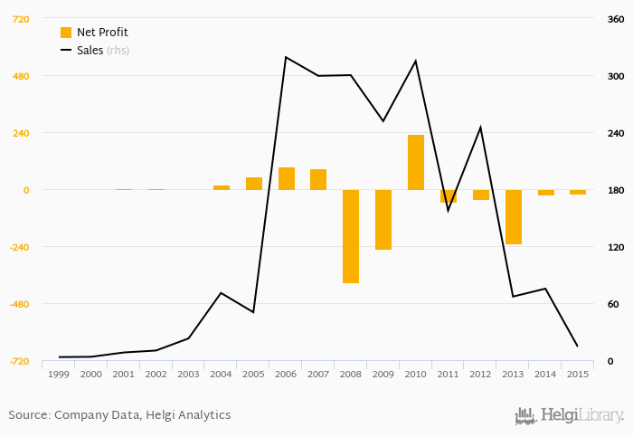 Sales have fallen by 12% a year on average since 2005. They reached a high of EUR 319 mil in 2006 and a low of EUR 3.17 mil in 1999.