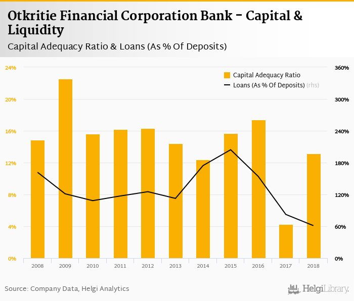 Comparing Otkritie Financial Corporation Bank with its closest peers, Sberbank ended the year 2018 with a capital adequacy ratio at 12.4% and loans to deposits of 93.7%, VTB Bank with 13.5% and 103% respectively and Alfa Bank some 18.2% in terms of capital adequacy and 92.5% of loans to deposits at the end of 2018.