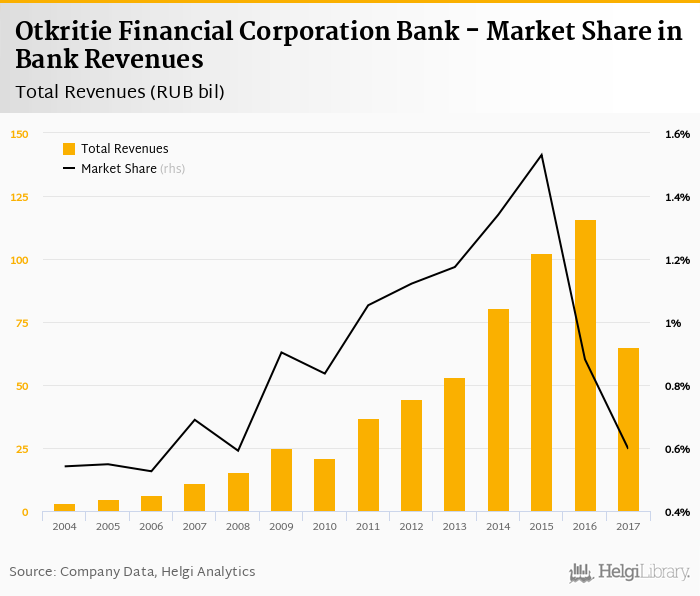 As a result, Otkritie Financial Corporation Bank accounted for 0.597% of all bank revenues generated by banks in Russia in 2017. Historically, the bank’s market share in total revenues reached an all time high of 1.53% in 2015 and an all time low of 0.526% in 2006.