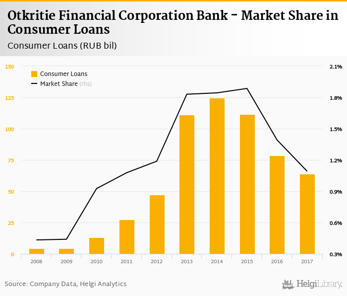 Otkritie Financial Corporation Bank accounted for 1.09% of all consumer loans issued in Russia at the end of 2017. Historically, the bank’s market share in consumer loans reached an all time high of 1.89% in 2015 and an all time low of 0.433% in 2008.