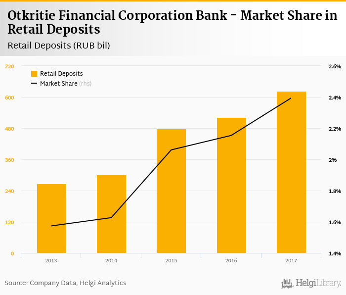 Otkritie Financial Corporation Bank accounted for 2.39% of all retail deposits taken by banks in Russia at the end of 2017. Historically, the bank’s market share in retail deposits reached an all time high of 2.39% in 2017 and an all time low of 1.57% in 2013.