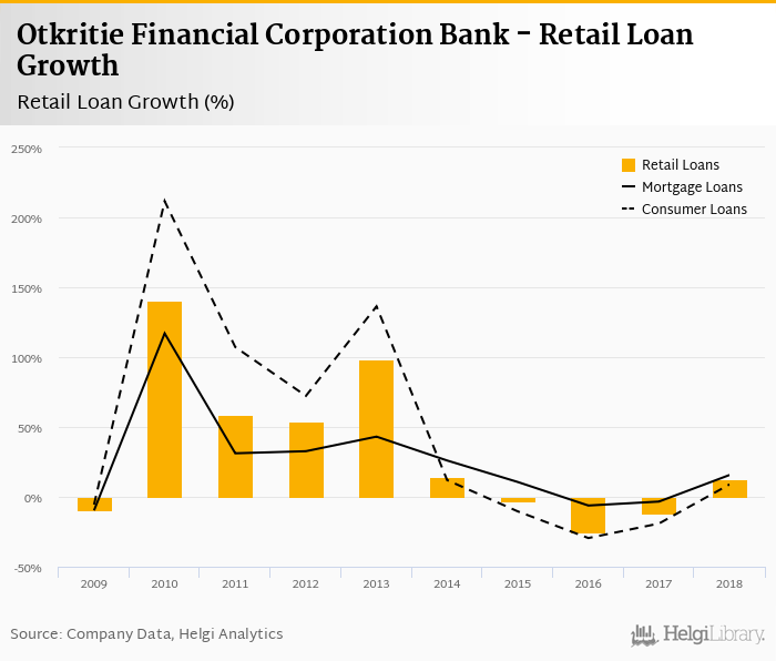 Otkritie Financial Corporation Bank's retail loans reached RUB 149 bil at the end of 2018, up 12.4% compared to the previous year. In the last decade, the average annual loan growth amounted to 0%.