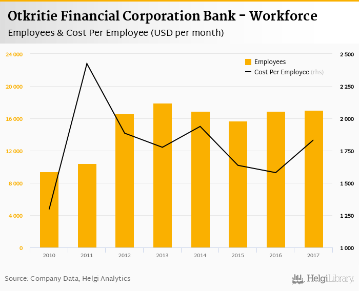 Otkritie Financial Corporation Bank employed 17,000 persons in 2017, up 0.568% when compared to the previous year. Historically, the bank's workforce hit an all time high of 17,890 persons in 2013 and an all time low of 9,408 in 2010.