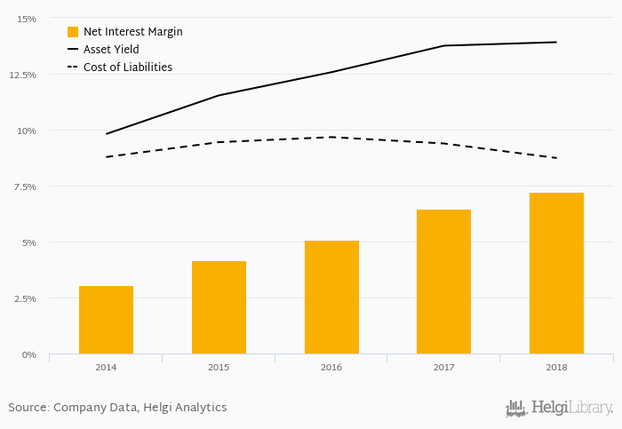 Average asset yield was 13.9% in 2018, up from 13.8% when compared to previous year. On the other hand, cost of funding amounted to 8.73% in 2018, down from 9.38%.