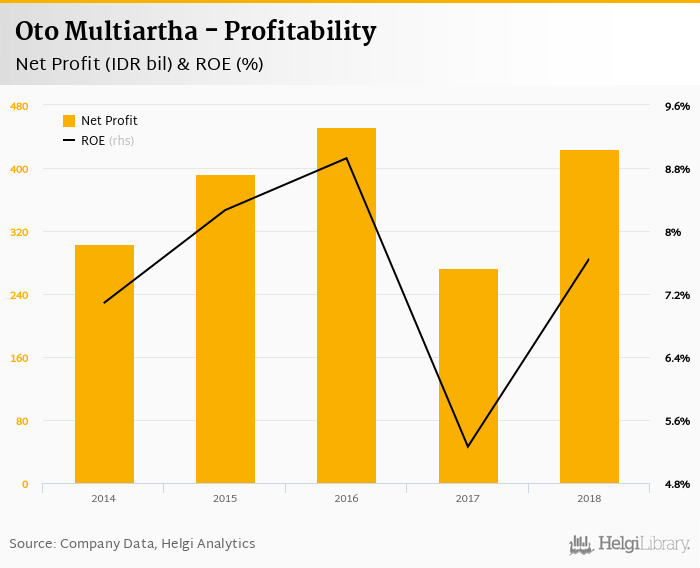 Oto Multiartha made a net profit of IDR 425 bil in 2018, up 55.7% compared to the previous year. This implies a return on equity of 7.65%.