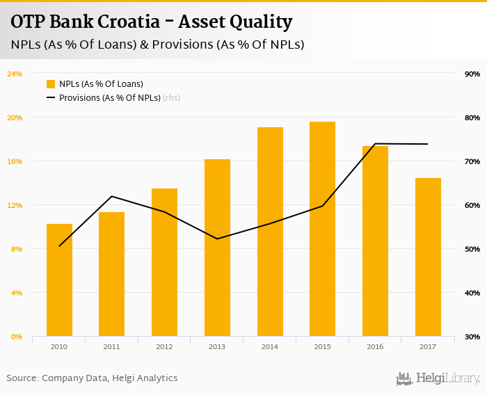 OTP Bank Croatia's non-performing loans reached 14.5% of total loans at the end of 2017, down from 17.4% compared to the previous year. Historically, the NPL ratio hit an all time high of 19.6% in 2015 and an all time low of 10.3% in 2010.