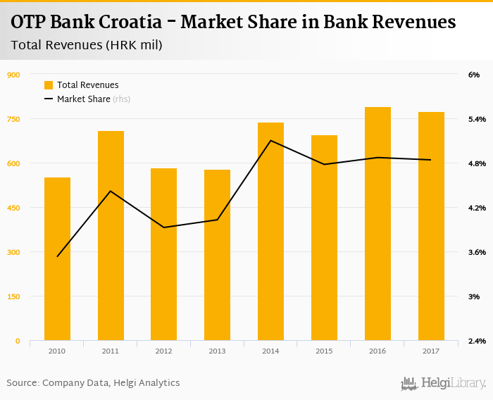As a result, OTP Bank Croatia accounted for 4.84% of all bank revenues generated by banks in Croatia in 2017. Historically, the bank’s market share in total revenues reached an all time high of 5.10% in 2014 and an all time low of 3.53% in 2010.