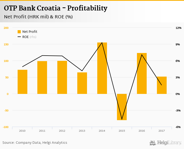 OTP Bank Croatia made a net profit of HRK 52.2 mil in 2017, down 57.7% compared to the previous year. This implies a return on equity of 1.53%.