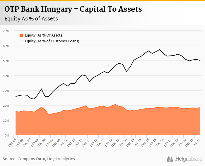 OTP Bank Hungary's Equity reached 5.23% of total assets in the 2Q2019, up from 4.85% for the previous year. As a share of net customer loans, the ratio amounted to 8.02% at the end of the second quarter of 2019.