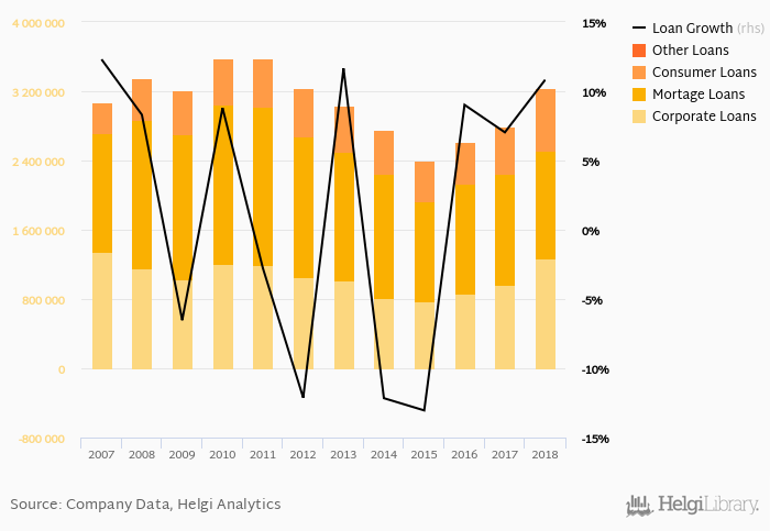 Mortgage loans represented 38.5% of the bank's loan book at the end of the year 2018, consumer further 22.3% and corporate loans 39.2% of total loans.