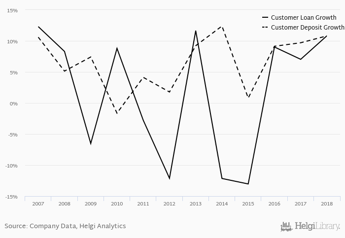 On the other hand, bank's customer deposit growth amounted to 10.8% at the end of 2018, up from 9.70% when compared to the previous year. Historically, the bank’s deposit growth reached an all time high of 12.4% in 2014 and an all time low of -1.64% in 2010. In the last decade, the average annual loan growth amounted to 6.28%.