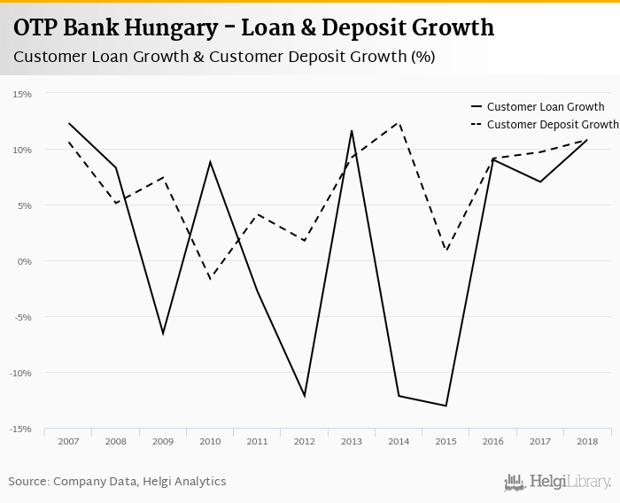OTP Bank Hungary's customer loan growth reached 10.8% in 2018, up from 7.03% compared to the previous year. Historically, the bank’s loans growth reached an all time high of 12.3% in 2007 and an all time low of -13.0% in 2015. In the last decade, the average annual loan growth amounted to -0.426%.