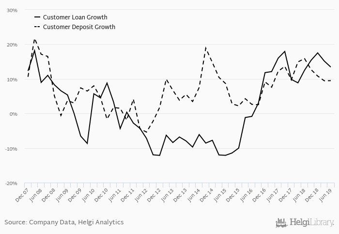 On the other hand, bank's customer deposit growth amounted to 9.48% at the end of 2019-06-30, down from 15.9% when compared to the previous year. Historically, the bank’s deposit growth reached an all time high of 21.7% in 2008-03-31 and an all time low of -5.39% in 2012-06-30. In the last decade, the average annual loan growth amounted to 6.56%.