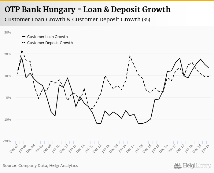 OTP Bank Hungary's customer loan growth reached 13.4% in 2019-06-30, up from 12.5% compared to the previous year. Historically, the bank’s loans growth reached an all time high of 18.1% in 2008-03-31 and an all time low of -12.1% in 2012-12-31. In the last decade, the average annual loan growth amounted to 0.398%.