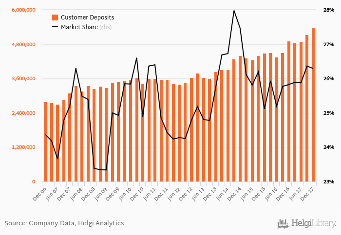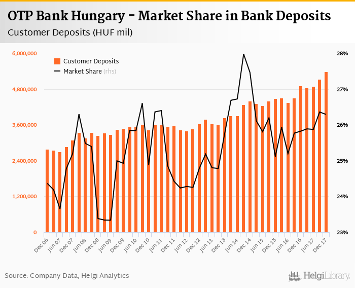 OTP Bank Hungary accounted for 26.3% of all customer deposits taken by banks in Hungary at the end of 2017-12-31. Historically, the bank’s market share in customer deposits reached an all time high of 28.0% in 2014-09-30 and an all time low of 23.3% in 2009-06-30.
