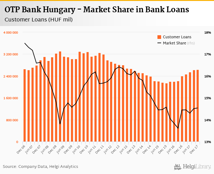 OTP Bank Hungary accounted for 14.5% of all customer loans issued in Hungary at the end of 2017-12-31. Historically, the bank’s market share in customer loans reached an all time high of 17.5% in 2006-12-31 and an all time low of 13.6% in 2016-09-30.