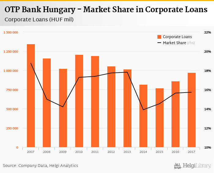 OTP Bank Hungary accounted for 15.7% of all corporate loans issued in Hungary at the end of 2017. Historically, the bank’s market share in corporate loans reached an all time high of 18.8% in 2007 and an all time low of 13.9% in 2014.