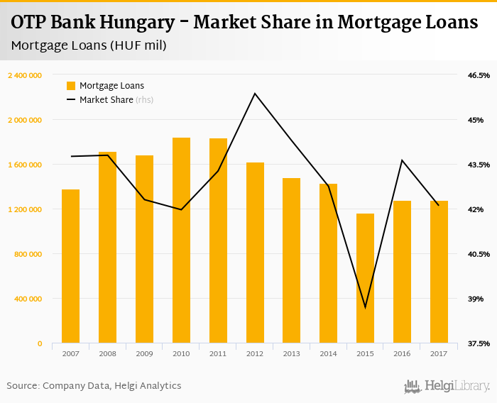OTP Bank Hungary accounted for 42.1% of all mortgage loans issued in Hungary at the end of 2017. Historically, the bank’s market share in mortgage loans reached an all time high of 45.9% in 2012 and an all time low of 38.7% in 2015.