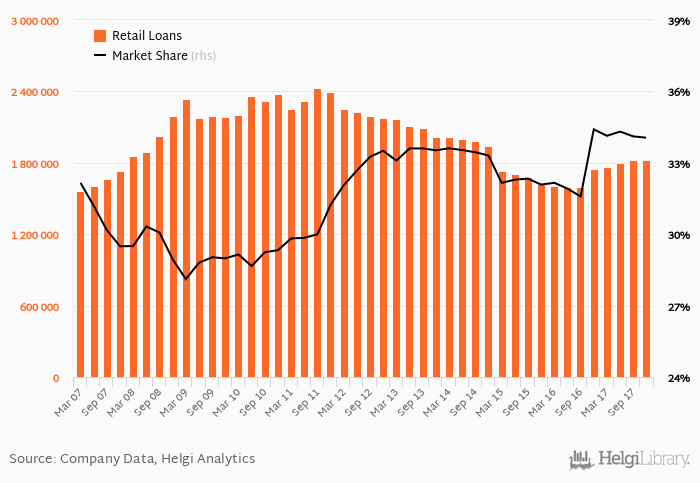 OTP Bank Hungary accounted for 34.1% of all retail loans issued in Hungary at the end of 4Q2017. Historically, the bank’s market share in retail loans reached an all time high of 34.4% in 4Q2016 and an all time low of 28.1% in 1Q2009.