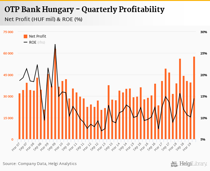 OTP Bank Hungary made a net profit of HUF 57,720 mil in the second quarter of 2019, up 2.6% when compared to the same period of last year. This implies a return on equity of 14.5%.
