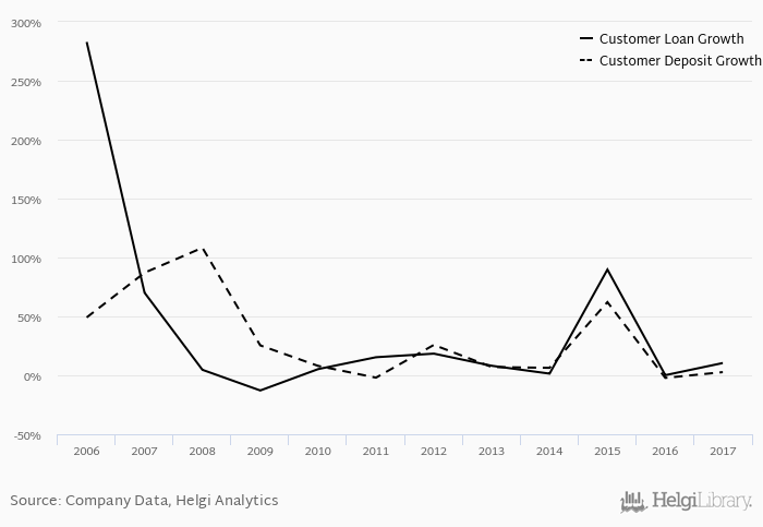 On the other hand, bank's customer deposit growth amounted to 2.75% at the end of 2017, up from -2.18% when compared to the previous year. Historically, the bank’s deposit growth reached an all time high of 108% in 2008 and an all time low of -2.18% in 2016. In the last decade, the average annual loan growth amounted to 20.5%.