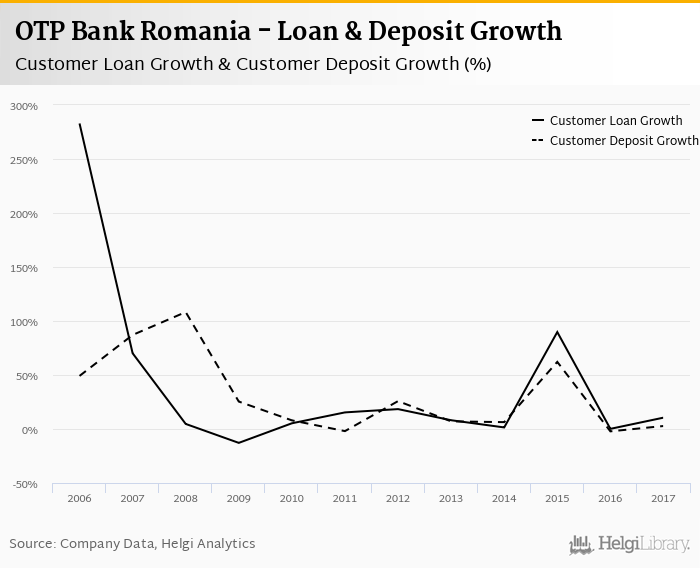 OTP Bank Romania's customer loan growth reached 10.5% in 2017, up from 0.131% compared to the previous year. Historically, the bank’s loans growth reached an all time high of 283% in 2006 and an all time low of -12.9% in 2009. In the last decade, the average annual loan growth amounted to 11.7%.
