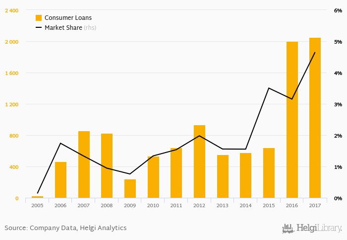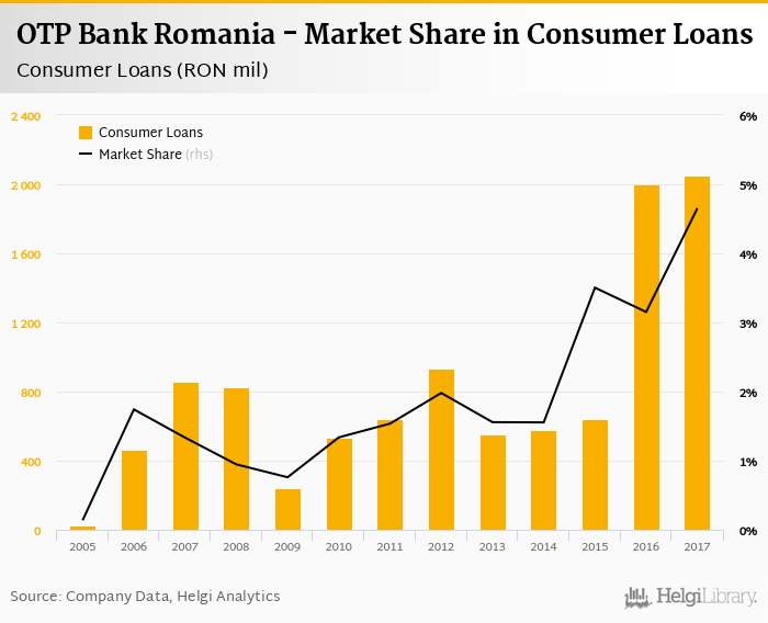 OTP Bank Romania accounted for 4.65% of all consumer loans issued in Romania at the end of 2017. Historically, the bank’s market share in consumer loans reached an all time high of 4.65% in 2017 and an all time low of 0.138% in 2005.