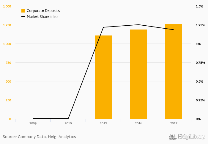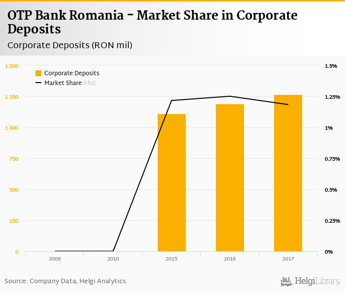 OTP Bank Romania accounted for 1.18% of all corporate deposits taken by banks in Romania at the end of 2017. Historically, the bank’s market share in corporate deposits reached an all time high of 1.25% in 2016 and an all time low of 0% in 2009.