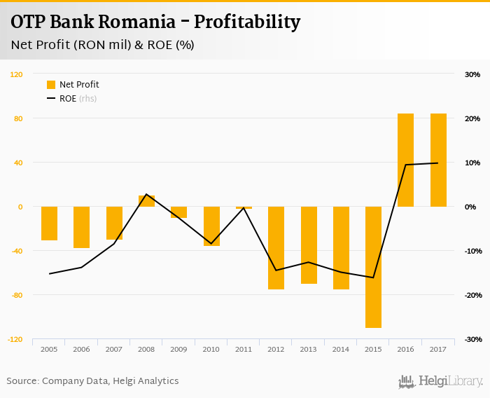 OTP Bank Romania made a net profit of RON 84.5 mil in 2017, up 0.325% compared to the previous year. This implies a return on equity of 9.73%.