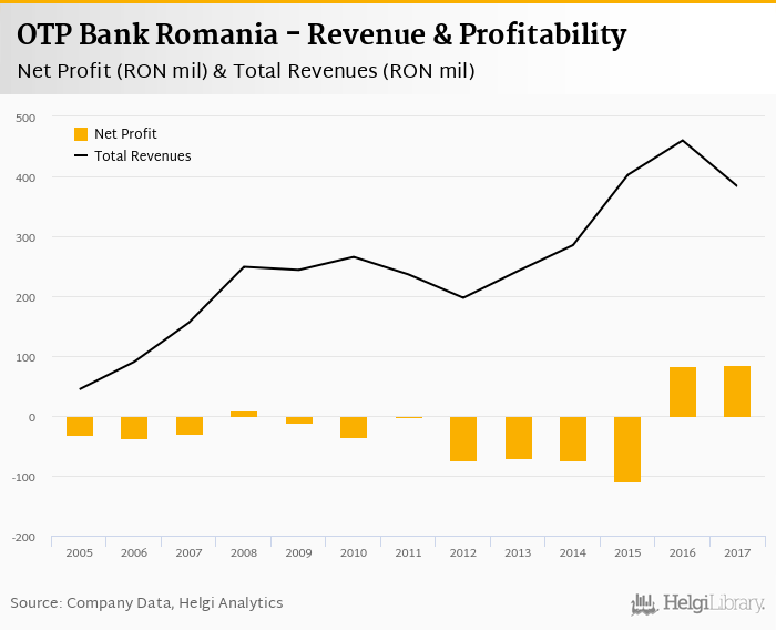 OTP Bank Romania made a net profit of RON 84.5 mil under revenues of RON 383 mil in 2017, up 0.325% and -16.7% respectively compared to the previous year.
