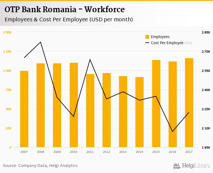OTP Bank Romania employed 1,163 persons in 2017, up 3.99% when compared to the previous year. Historically, the bank's workforce hit an all time high of 1,163 persons in 2017 and an all time low of 918 in 2014.