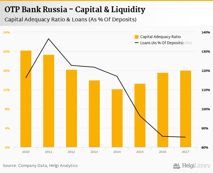 OTP Bank Russia's capital adequacy ratio reached 16.0% at the end of 2017, up from 15.5% compared to the previous year. Historically, the bank’s capital ratio hit an all time high of 20.2% in 2010 and an all time low of 12.1% in 2014.