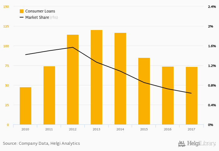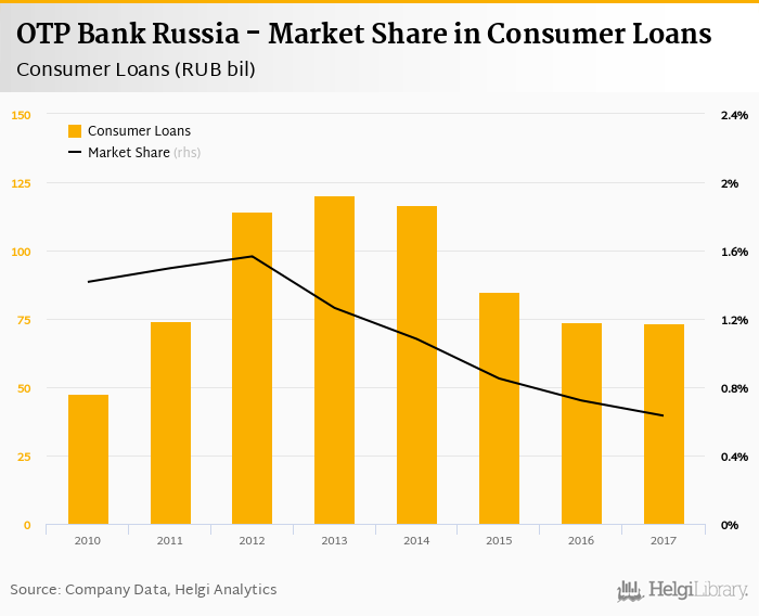 OTP Bank Russia accounted for 0.633% of all consumer loans issued in Russia at the end of 2017. Historically, the bank’s market share in consumer loans reached an all time high of 1.57% in 2012 and an all time low of 0.633% in 2017.