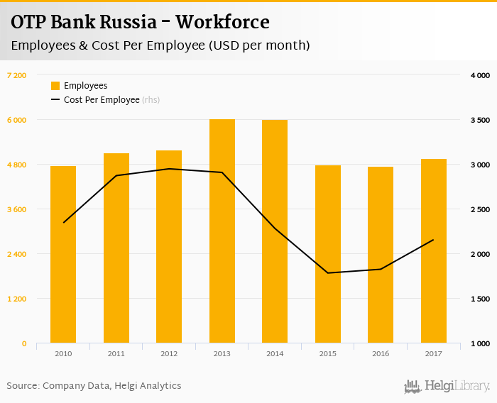 OTP Bank Russia employed 4,956 persons in 2017, up 4.46% when compared to the previous year. Historically, the bank's workforce hit an all time high of 6,020 persons in 2013 and an all time low of 4,744 in 2016.