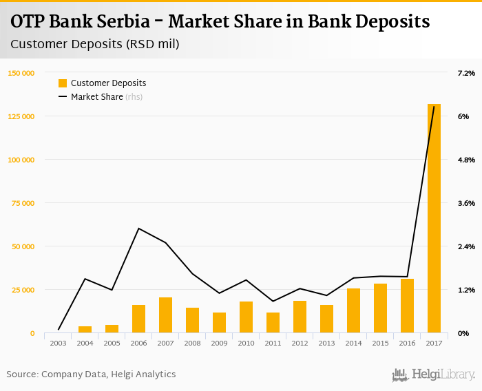 OTP Bank Serbia accounted for 6.26% of all customer deposits taken by banks in Serbia at the end of 2017. Historically, the bank’s market share in customer deposits reached an all time high of 6.26% in 2017 and an all time low of 0.069% in 2003.