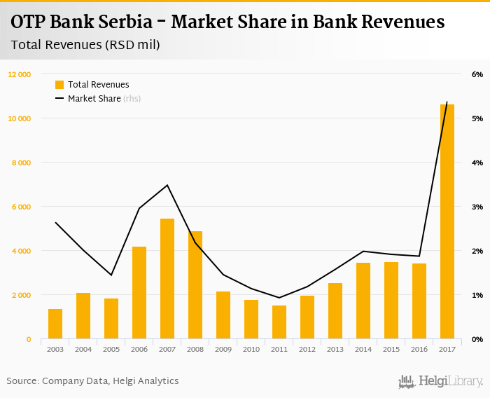As a result, OTP Bank Serbia accounted for 5.37% of all bank revenues generated by banks in Serbia in 2017. Historically, the bank’s market share in total revenues reached an all time high of 5.37% in 2017 and an all time low of 0.922% in 2011.