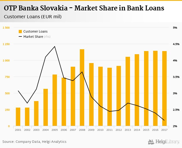 OTP Banka Slovakia accounted for 2.16% of all customer loans issued in Slovakia at the end of 2017. Historically, the bank’s market share in customer loans reached an all time high of 4.42% in 2005 and an all time low of 2.16% in 2017.