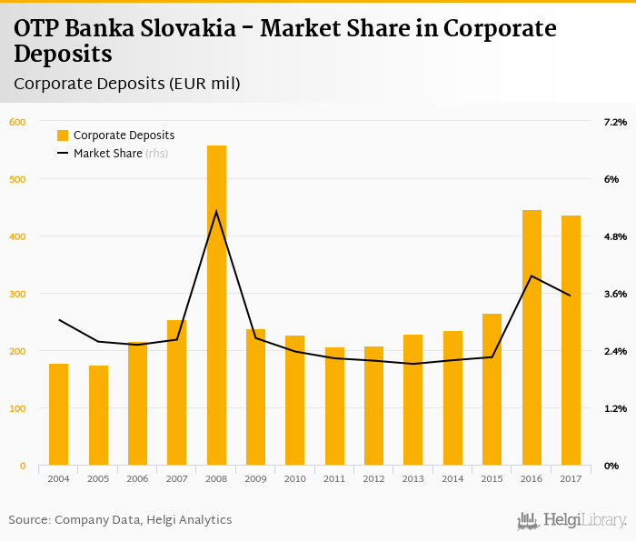 OTP Banka Slovakia accounted for 3.53% of all corporate deposits taken by banks in Slovakia at the end of 2017. Historically, the bank’s market share in corporate deposits reached an all time high of 5.30% in 2008 and an all time low of 2.11% in 2013.