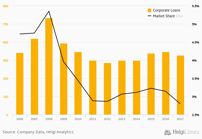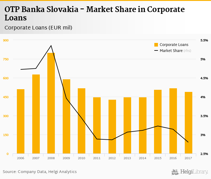 OTP Banka Slovakia accounted for 2.80% of all corporate loans issued in Slovakia at the end of 2017. Historically, the bank’s market share in corporate loans reached an all time high of 5.35% in 2008 and an all time low of 2.80% in 2017.