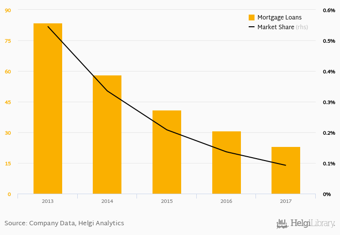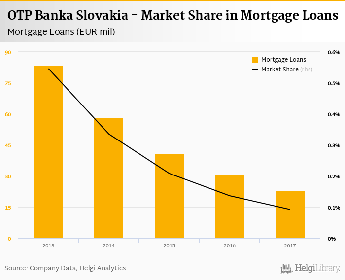 OTP Banka Slovakia accounted for 0.092% of all mortgage loans issued in Slovakia at the end of 2017. Historically, the bank’s market share in mortgage loans reached an all time high of 0.546% in 2013 and an all time low of 0.092% in 2017.
