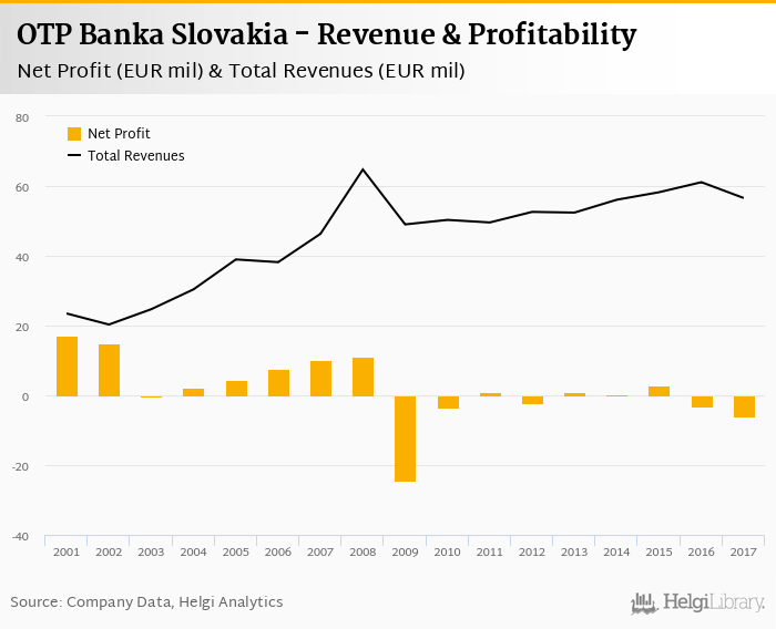 OTP Banka Slovakia made a net profit of EUR -5.93 mil under revenues of EUR 56.6 mil in 2017, up -96.3% and -7.43% respectively compared to the previous year.